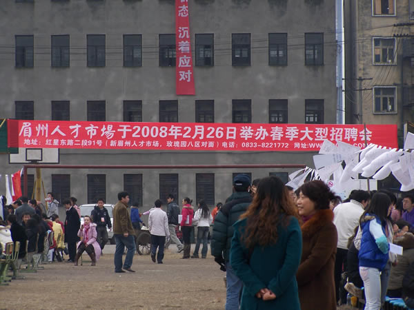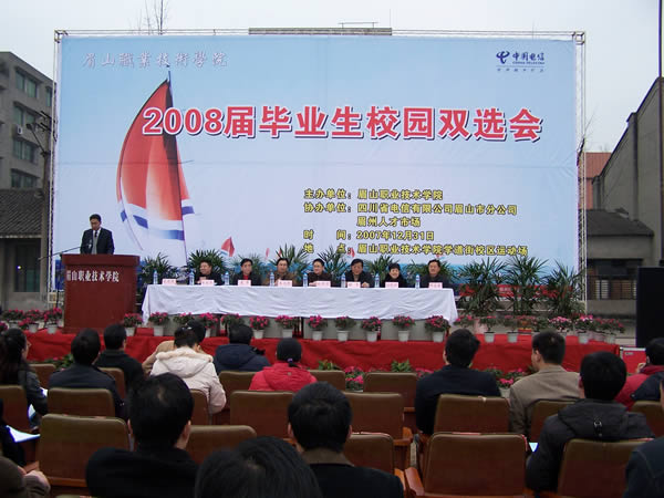 2007年12月31日上午10時(shí),眉州人才市場與眉山職業(yè)技術(shù)學(xué)院聯(lián)合舉辦的“2008屆畢業(yè)生雙選會”隆重開幕,此次盛會是眉州人才市場與眉山職業(yè)技術(shù)學(xué)院為解決應(yīng)屆畢業(yè)生就業(yè)的重大舉措,推進(jìn)了該校畢業(yè)生就業(yè)工作,促進(jìn)畢業(yè)生充分就業(yè),為用人單位和畢業(yè)生提供一個(gè)雙向選擇的平臺,此次盛會有近150家招聘單位蒞臨招聘,2000余名求職者到會求職。